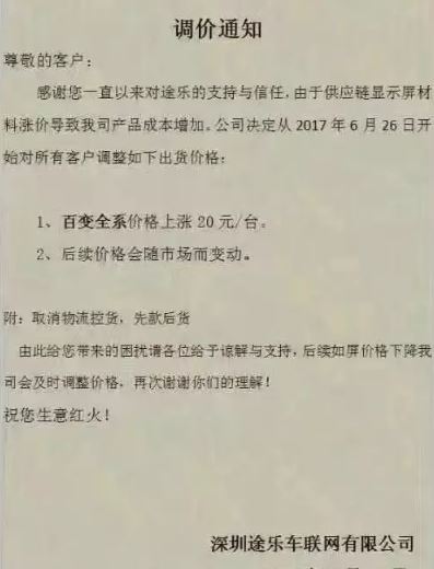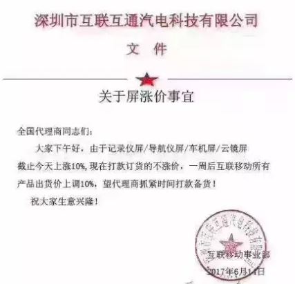 在6月11日,車載大屏機供應商互聯互通汽電科技向代理商發(fā)布漲價通知:由于記錄儀、導航儀屏、車機屏、云鏡屏截至今天上漲10%,一周后產品出貨價上調10%。