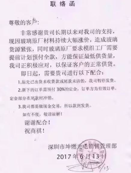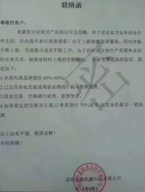從漲價通知函看,車載大屏機廠商漲價的原因基本相同,無外乎是,原材料漲價導致采購物料成本快速上漲,導致企業(yè)運營成本上升,有一些廠家沒利潤,養(yǎng)不起工廠,直接倒閉了。同時,對于一些回款慢的客戶,已經停止供貨,并要求先繳納30-50%的定金,以及現金交易、款到發(fā)貨。