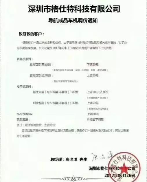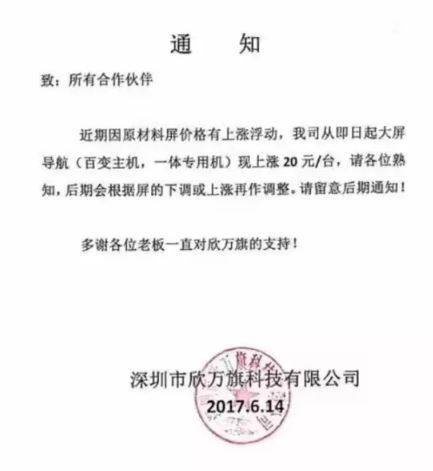 隨后,深圳欣萬旗科技也跟進發(fā)出漲價公告:近期因原材料屏價格有上漲浮動,我司從即日起大屏導航(百變主機,一體專用機)現上漲20元/臺。